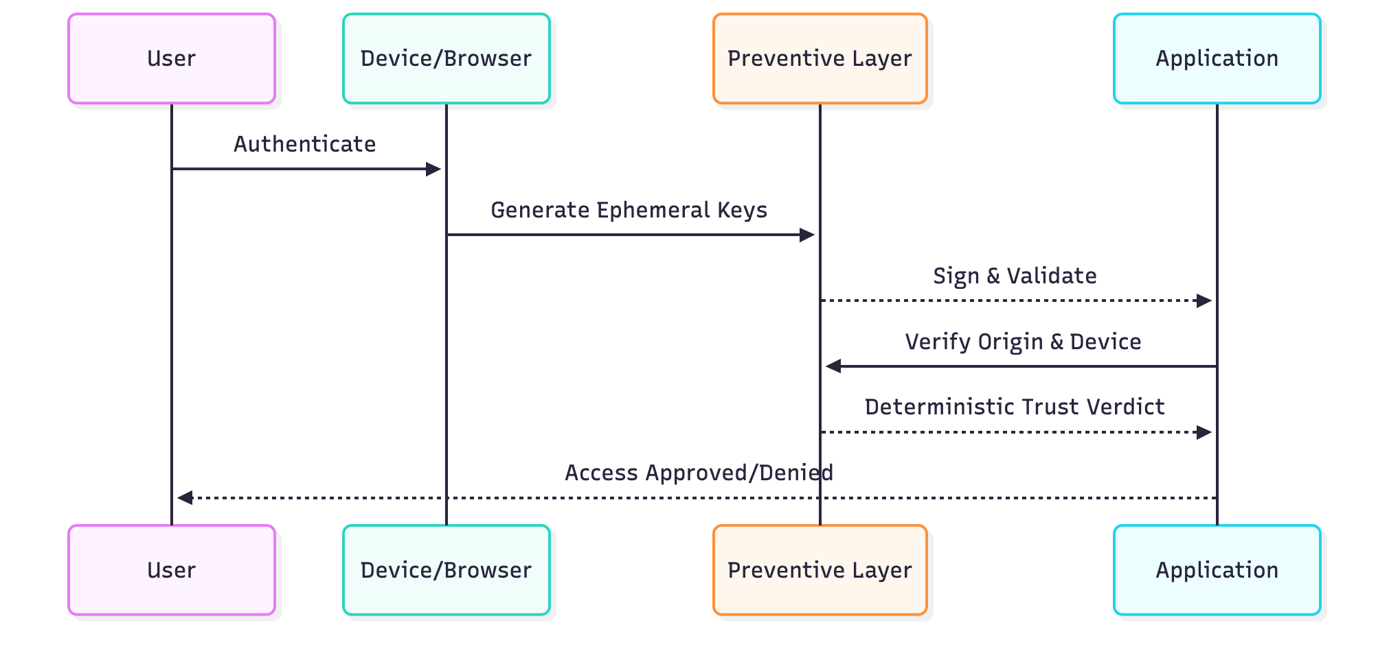 Traditional identity systems rely on probabilistic risk assessments, where a user's legitimacy is judged based on indirect context and behavior signals. Deterministic trust replaces this guesswork with cryptographic proof, providing a definitive yes or no for each validation, thereby removing ambiguity and ensuring consistent enforcement. Key aspects of deterministic trust include binary trust models, ephemeral cryptographic keys, binding to devices and origins, continuous enforcement, and automated, impartial validation. This approach ensures that decisions are consistent, verifiable, and free from human influence error.